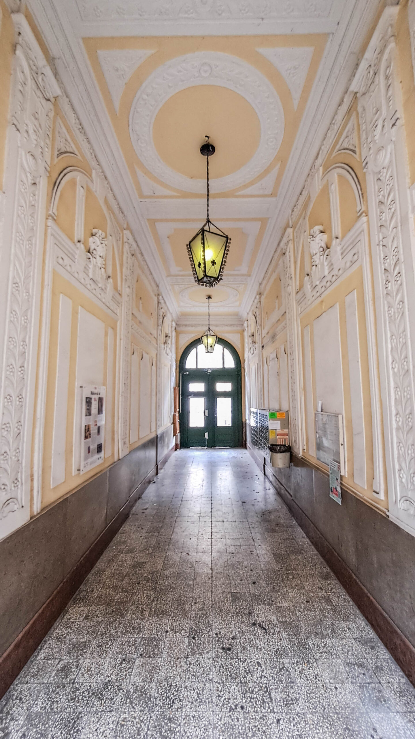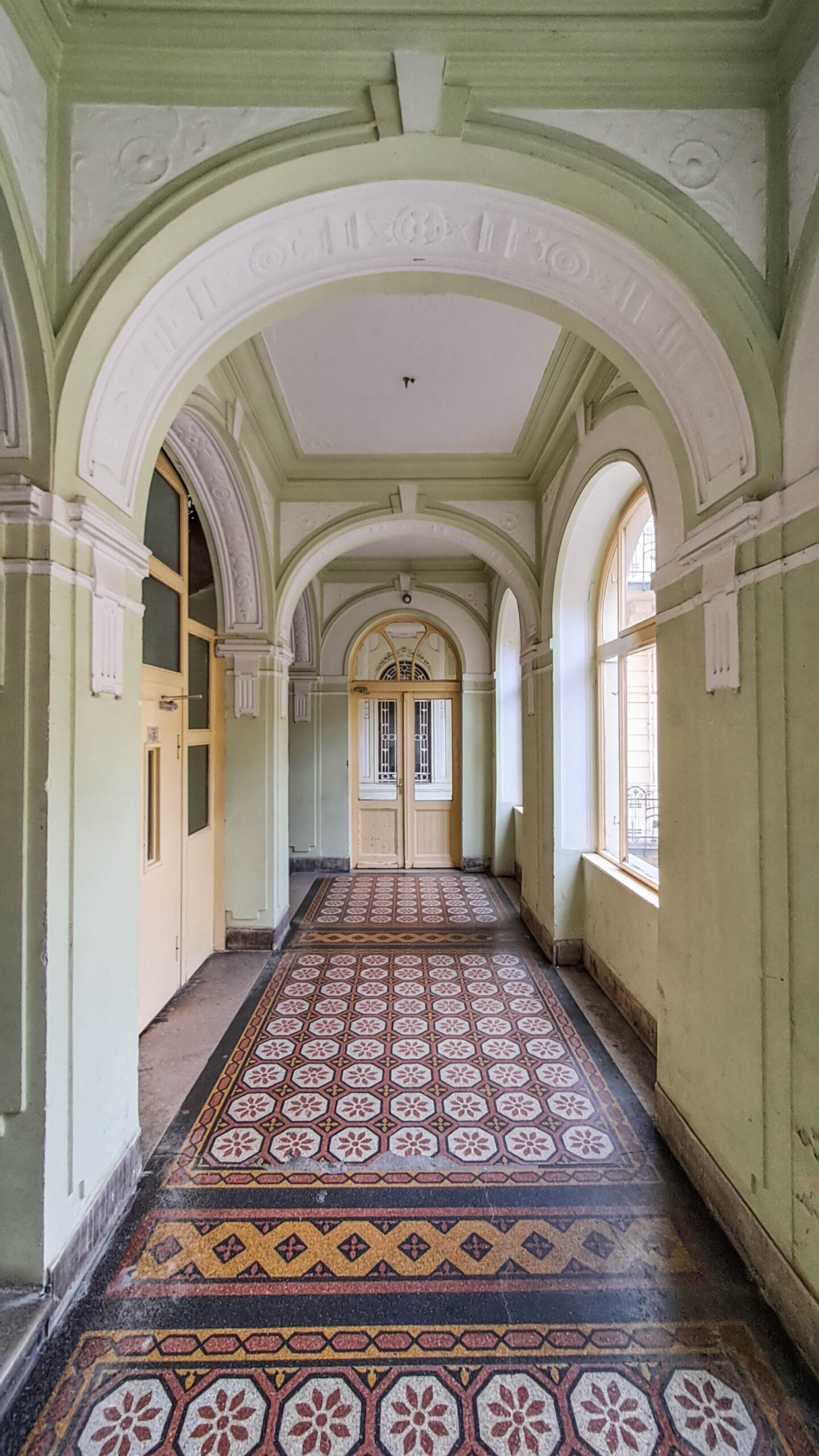 The facade of the eclectic BUILDING with a double courtyard, built in 1905, is richly decorated. The ceiling of the spacious lobby is decorated with stucco, and there are no trash cans to deface the entrance. Fortunately, some of the door and window panes have survived, on which the floral, etched patterns can still be seen. The wrought iron work is also remarkable, as is the terrazzo coverings which are visible in the staircase.